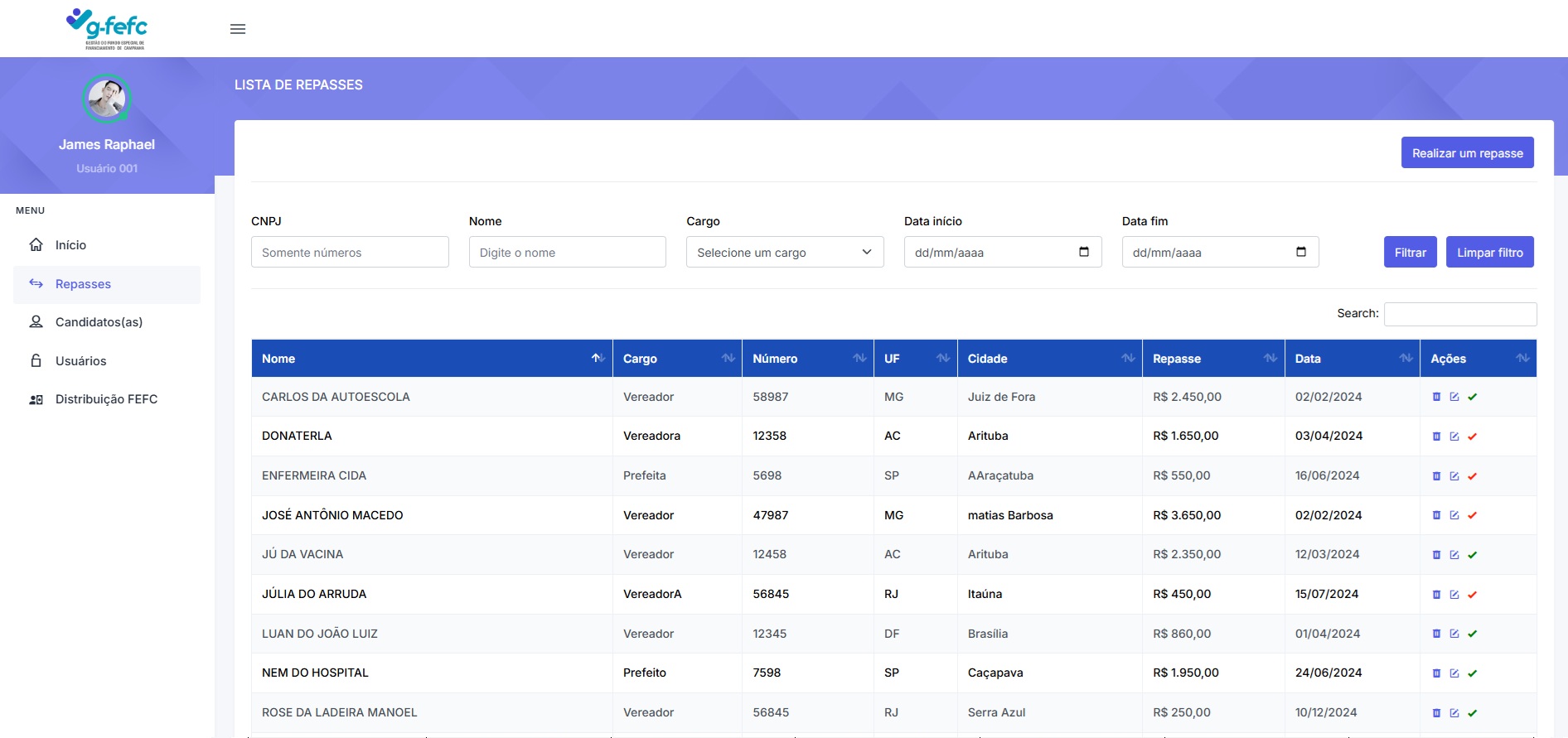Garantimos que todos os repasses do FEFC sejam realizados de maneira clara e acessível, permitindo que a os gestores e recebedores (nacionais e regionais) acompanhe a utilização dos recursos.